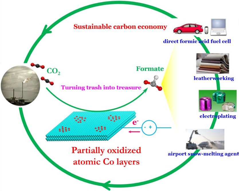 To evaluate the role of the two different catalytic sites, here Prof. Xie and Prof. Sun’s groups fabricate two kinds of four-atom-thick layers: pure cobalt metal, and co-existing domains of cobalt metal and cobalt oxide. Cobalt mainly produces formate (HCOO−) during CO2 electroreduction; they find that surface cobalt atoms of the atomically thin layers have higher intrinsic activity and selectivity towards formate production, at lower overpotentials, than do surface cobalt atoms on bulk samples. Partial oxidation of the atomic layers further increases their intrinsic activity, allowing us to realize stable current densities of about 10 milliamperes per square centimetre over 40 hours, with approximately 90 per cent formate selectivity at an overpotential of only 0.24 volts, which outperforms previously reported metal or metal oxide electrodes evaluated under comparable conditions. The correct morphology and oxidation state can thus transform a material from one considered nearly non-catalytic for the CO2 electroreduction reaction into an active catalyst. These findings point to new opportunities for manipulating and improving the CO2 electroreduction properties of metal systems, especially once the influence of both the atomic-scale structure and the presence of oxide are mechanistically better understood.