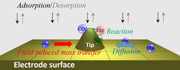 Electrocatalytic reduction reaction of carbon dioxide (CO2RR) provides an attractive way to convert carbon dioxide (CO2) to carbon monoxide (CO) from which more complex carbon-based fuels and feedstocks can be synthesized. As CO2 is a thermodynamically stable molecule, tremendous efforts have been made in recent years to find suitable catalysts for electrocatalytic CO2RR. It is recently reported that the electrocatalytic reduction reaction of carbon dioxide can be significantly enhanced by the use of a sharp-tip electrode. However, the experimentally observed rate enhancement is many orders of magnitudes smaller than what would be expected from an energetic point of view. Dr. Huijun Jiang, Prof. Zhonghuai Hou and Prof. Yi Luo in USTC proposed a novel reaction-diffusion kinetic model to resolve above mentioned mechanistic problem. The experimentally observed sharp-tip enhanced reaction and the maximal producing rate of carbon monoxide under different electrode potentials were well-reproduced. Remarkably, it was found that the optimal CO2RR performance shows a strong dependence on the interaction between CO2 and the local electric field, on the adsorption rate of CO2, but not on the reaction barrier. Two new strategies to further enhance the reaction rate ware also proposed. The findings highlight the importance of kinetics in modeling electrocatalytic reactions.
