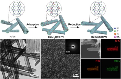 To date, platinum (Pt)-based compounds are considered to be one of the most effective hydrogen evolution reaction (HER) catalysts under acidic conditions because of the appropriate strength of the Pt-H bond, which facilitates hydrogen desorption from the surface of the catalyst. However, the scarcity and high cost of Pt greatly limits its use in industrial applications. Recently, non-precious metal-based catalysts have been studied extensively, such as carbides, nitrides, oxides, phosphides, sulfides, and selenides of transition metals. Unfortunately, these catalysts generally exhibit relatively higher overpotentials, Tafel slopes, and lower stabilities under large current densities in comparison to Pt/C. As for cheaper Ru metal, which shows similar metal-hydrogen bond strengths compared with that of Pt, only a few HER applications have been reported unfortunately. As is well-known, the support material plays an important role in optimizing the local geometric and electronic structures of single-metal sites because of strong metal–support interactions. In the development of support materials, the stabilizing effect and the tuning effect over the single catalytic sites should be considered. To date, supports that guarantee atomic dispersion of metal sites are largely limited to oxides and carbon-based materials. However, metallic oxides often exhibit poor electrical conductivity and resistance to acidic corrosion in electrocatalytic tests. Additionally, the carbon-based matrix also shows deficiencies in stability during the electrocatalytic process. Recently, iChEM researchers Professor Wu Yuen from the University of Science and Technology of China collaborated with the Associate Professor Duan Xuezhi of the East China University of Science and Technology is synthesized a tetra-nitrogen-coordinated Ru single atom catalyst based on the new non-carbon phosphorus nanotube carrier by the traditional co-reduction method. For acid test, The Ru single atoms on the PN matrix catalyst exhibits low overpotentials at 10 mA/cm2 (24 mV in 0.5m H2SO4 solution), a Tafel slope of 38 mV/dec, and robust stability at large current density. Furthermore, Density functional theory calculations have demonstrated that the adsorption of H* on PN matrix is closer to zero than those of Ru/C, Ru SAs@C3N4, and Ru SAs@C, thus resulting in a mediated adsorption–desorption behavior of Ru SAs@PN to facilitate the overall HER performance.