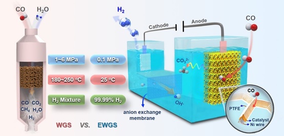 Electrochemically decoupling the WGS redox reaction to separated cathodic reduction reaction and anodic oxidation reaction in an electrolytic cell and using electric-potential as the driving force of the process is a promising approach of circumventing the aforementioned harsh conditions. Herein, we report for the first time a completely new process of directly producing high purity hydrogen (over 99.99%) with low energy cost and high energy conversion efficiency, i.e. the room-temperature electrochemical water-gas shift (EWGS) process. In the EWGS process, CO is oxidized on the anode, where the product CO2 further reacts with hydroxide ion forming CO32- and thereby is transformed into a potassium carbonate avoiding the pollution caused by CO2 emission. Meanwhile, high purity H2 is produced from H2O reduction on the cathode. Anion exchange membrane was employed for separating the cathode and anode, maintaining the balance of ion concentration of electrolyte, and avoiding the separation process in WGS in principle. Through rational design of anode structure to facilitate CO diffusion and PtCu catalyst to optimize CO adsorption, the electrolysis process can be effectively driven at room temperature and atmospheric pressure with a faradaic efficiency of approximately 100%. Comparing with the 1.23 volts for the electrolysis of water, the anodic onset potential is lowered to almost 0 volts at room temperature and atmospheric pressure. The optimized PtCu catalyst achieves a current density of 70.0 mA cm-2 at 0.6 volts which is over 12 times that of commercial Pt/C (40 wt.%) catalyst, and remains stable for even more than 475 hours. Besides, cooperating with Prof. Hai-Yan Su, combining DFT, we found that the CO adsorption on Pt site of Pt3Cu is weakened which is the reason for high activity of EWGS. This study achieves an original innovation for a new process of hydrogen production via multidisciplinary crossing. Considering the abundant CO feedstock, and the advantages of low energy input and high energy conversion efficiency in contrast to either WGS or water electrolysis, the EWGS process provides a promising route to produce high purity hydrogen in the future.