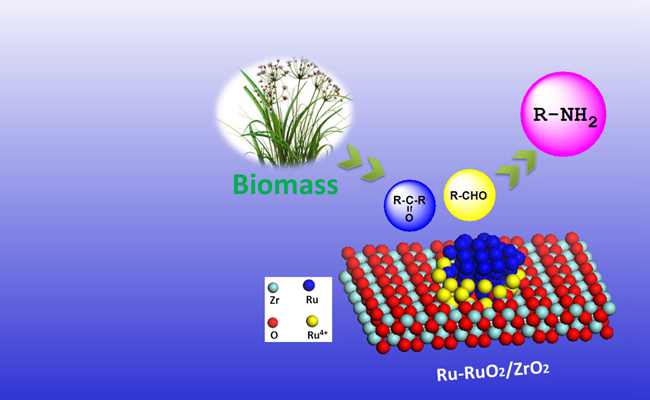 Transformation of biomass into valuable nitrogen-containing compounds is highly desired, yet limited success has been achieved. Here Prof. Tao Zhang from DICP reported an efficient catalyst system, partially reduced Ru/ZrO2, which could catalyze the reductive amination of a variety of biomass-derived aldehydes/ketones in aqueous ammonia. With this approach, a spectrum of renewable primary amines was produced in good to excellent yields. Moreover, they have demonstrated a two-step approach for production of ethanolamine, a large-market nitrogen-containing chemical, from lignocellulose in an overall yield of 10 %. Extensive characterizations showed that Ru/ZrO2-containing multivalence Ru association species worked as a bifunctional catalyst, with RuO2 as acidic promoter to facilitate the activation of carbonyl groups and Ru as active sites for the subsequent imine hydrogenation.