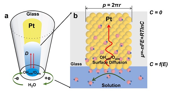 Prof. Zhong-Qun Tian and Dongping Zhan’s group made an important progress on the surface electrochemistry and realized the directly quantitative measurements of surface mobility of adsorbates on platinum catalyst. The adsorption and mobility of oxygen adspecieson platinum (Pt) surface are crucial for the oxidation of surface-absorbed carbon monoxide (CO), which causes the deactivation of Pt catalyst in fuelcells. By employing nanoelectrode and ultramicroelectrode techniques, they have observed the surface mobility of oxygen adspecies produced by the dissociative adsorption of H2O and the surface reaction between the oxygen adspecies and the pre-adsorbed CO on the Pt surface. The desorption charge of oxygen adspecieson a Pt nanoelectrodehas been found to be in proportionto the reciprocal of the square root of scan rate. Using this informaiton, the apparent surface diffusion coefficient of oxgenadspecies has been determined to be(5.61 ± 0.84) × 10-10cm2/s at 25 ºC. The pre-exponential factor D0and the activation energies ΔEd were determined to be 1.62×10-7cm2/s and 13.67 kJ/mol, respectively.During the surface oxidation of CO, two current peaks are observed, which are attributed to direct CO oxidation at the Pt/electrolyte interface and the surface mobility of the oxygen adspecies on the adjcent Pt surface, respectively. These results demonstrate that the surface mobility of oxygen adspecies plays an important role in the anti-poisoning and reactivation of Pt catalyst. Furthermore, the research provides an innovative method for the quantitative measurements of surface mobility for the surface science and heterogonous catalysis. The results were published recently in J. Am. Chem. Soc., DOI: 10.1021/jacs.6b05259.