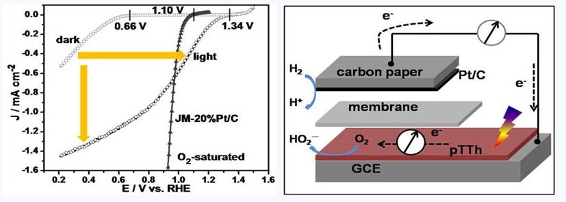 The oxygen reduction reaction (ORR) is a key step in H2–O2 fuel cells, which, however, suffers from slow kinetics even for state-of-the-art catalysts. In this work, by making use of photocatalysis, the ORR was significantly accelerated with a polymer semiconductor (polyterthiophene). The onset potential underwent a positive shift from 0.66 to 1.34 V, and the current was enhanced by a factor of 44 at 0.6 V. The improvement was further confirmed in a proof-of-concept light-driven H2–O2 fuel cell, in which the open circuit voltage (Voc) increased from 0.64 to 1.18 V, and the short circuit current (Jsc) was doubled. This novel tandem structure combining a polymer solar cell and a fuel cell enables the simultaneous utilization of photo- and electrochemical energy, showing promising potential for applications in energy conversion and storage.