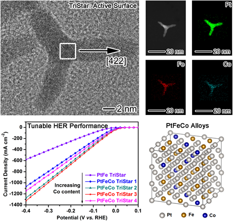 10 get improvement compared with other catalyst. The PtFeCo TriStar nanostructures well combines the surface and electronic structures design with the composition engineering, and they provide fresh insights into rationally designing the alloy electrocatalysts with low-cost and high-performance.