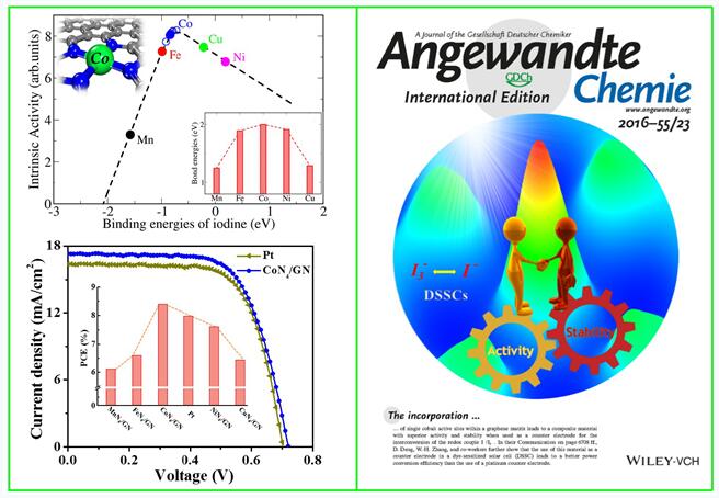Recently, on the basis of their previous studies towards two-dimensional catalytic materials and nano confined catalysis, iChEM researcher Assoc. Prof. Dehui Deng and Prof. Xinhe Bao etc. from SKLC, DICP, in cooperation with Prof. Wen-Hua Zhang from Academy of Engineering Physics, found that graphene confined CoN4 structure possessed double-optimum in its activity and stability in catalyzing reduction reaction of I3- to I- in dye-sensitized solar cells (DSSCs). This work has recently been published as a communication in Angew. Chem. Int. Ed. (Angew. Chem. Int. Ed. 2016, 55, 6708), and has been selected as “Inside Back Cover”.