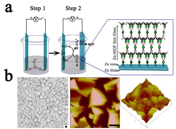 Recently, iChEM Researcher Rong Cao, Professor at Fujian Institute of Research on the Structure of Matter, Chinese Academy of Sciences, have developed a facile strategy by which interpenetrated, crystalline metal-organic framework films were deposited onto conductive metal-plate anodes via in situ temperature-controlled electrochemical assembly. (Nature Commun. 2016, 7, 1-8. DOI:10.1038/ncomms11830). The resulting MOF thin films exhibit enhanced dielectric properties compared to their bulk powders MOFs. This study demonstrates the successful implementation of the rational design of metal-organic framework thin films on conductive supports with high-performance dielectric properties.