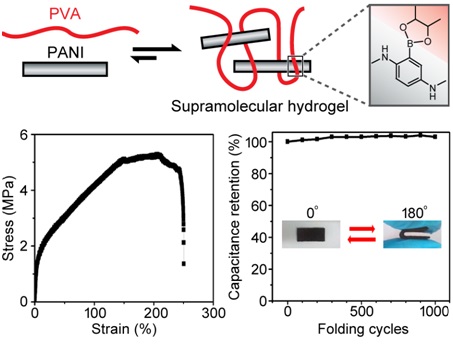 To address this challenge, the researchers led by Prof. MA have developed a new strategy to prepare conductive hydrogels with outstanding mechanical and electrochemical properties. The supramolecular assembly of a rigid conductive polymer (polyaniline) with a soft hydrophilic polymer (polyvinyl alcohol) through dynamic boronate bonds yields polyaniline–polyvinyl alcohol hydrogel (PPH), which shows remarkable tensile strength (5.3 MPa) and electrochemical capacitance (928 F g-1). The flexible solid-state supercapacitor based on PPH provides a large capacitance (306 mF cm-2 and 153 F g-1) and a high energy density of 13.6 Wh kg-1, superior to other flexible supercapacitors. The robustness of the PPH-based supercapacitor is demonstrated by the 100 % capacitance retention after 1000 mechanical folding cycles, and the 90 % capacitance retention after 1000 galvanostatic charge–discharge cycles. The high activity and robustness enable the PPH-based supercapacitor as a promising power device for flexible electronics.