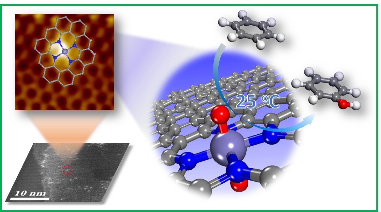 During the past five years, this research group has achieved a highly dispersed single FeN4 center with CUS Fe sites confined in a graphene matrix using N atoms as “anchors” via high-energy ball milling of iron phthalocyanine and graphene nanosheets under controllable conditions. In collaborations with Prof. Litao Sun’s group (SEU-FEI Nano-Pico Center, Southeast University), Prof. Jianqi Li’s group (Institute of Physics, CAS), Canadian Light Source, Shanghai Synchrotron Radiation Facility and Prof. Junhu Wang (Mossbauer Effect Data Center, DICP) etc., they, for the first time, directly observed the atomic structure of the FeN4 centers in graphene nanosheets. Further DFT calculations indicate that FeN4 centers are well stabilized by the graphene matrix, and H2O2 molecule can be easily dissociated on the confined iron site by forming O=FeN4=O centers. The activation barriers of oxidation of benzene to phenol on these centers are quite moderate for reactions to proceed at room temperature and even at 0 °C. These findings pave the way toward the design of highly efficient nonprecious catalysts for catalytic oxidation reactions at low temperature.