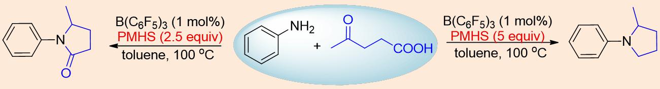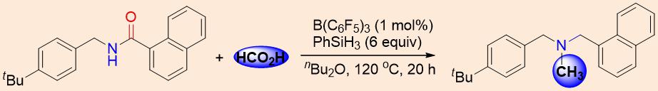 Besides, they also studied the scope of carboxylic acids to explore the generality of this method. They also successfully applied biomass-derived levulinic acid to this transformation (Figure 2). It is noteworthy that this is the first report about Lewis acid [B(C6F5)3] that it can not only be applied in multi-bond reduction but also in C-N bond formation.