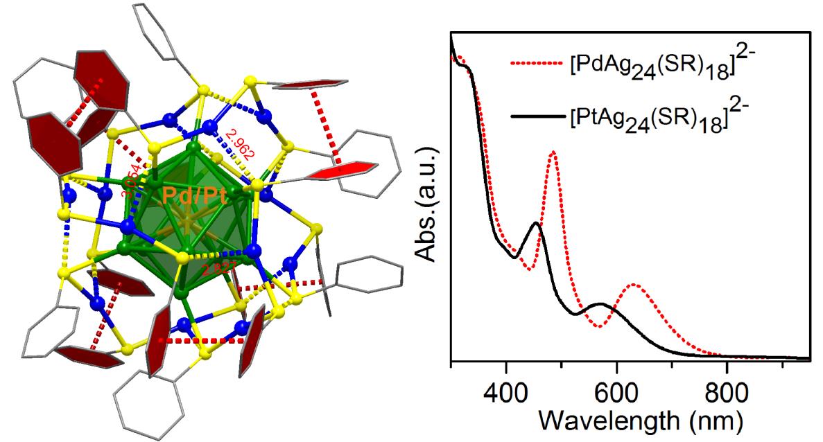 The metallic cluster protected by thiol groups (-SRs) is paid close attention to because it’s the epitome of stable noble metallic nanoparticles. Till now, there is no report published saying that Au and Ag nanoclusters protected by thiol groups have the same structure, although Au and Ag are family metals. After the confirmation of the structure of star nanocluster, Au25(SR)18, a plenty of experiments have taken place to study the synthesis and properties of Ag25(SR)18 and Ag doping Au25(SR)18. The theoretical computation also gave a prediction that Ag25(SR)18 may have a similar structure with Au25(SR)18. But all of those above are not confirmed. This work successfully obtained [MAg24(SR)18]2-(M=Pd, Pt) which was protected by thiol groups by introducing Pd and Pt and then analyzed its single-crystal structure. The structural analysis indicated that though the cluster [MAg24(SR)18]2- has a similar framework as Au25(SR)18 which was composed of a M@Ag12, a solid dodecahedron, and six [Ag2(SR)3], the superficial “staple” units, there are still some differences that the six [Ag2(SR)3] on the surface of [MAg24(SR)18]2- have different degrees of distortion and there exist adjacent [Ag2(SR)3]s Ag…S non-covalent bonds. The bonds also promote the π-π effect of benzene rings on the superficial ligands so that two [MAg24(SR)18]2- chiral clusters with two different distributions of the superficial ligands occur. Moreover, this work indicated that doping exotic metals in metallic clusters can be a valid way to control the electronic structures and optical properties. Even the doping of one atom can change the properties of clusters.