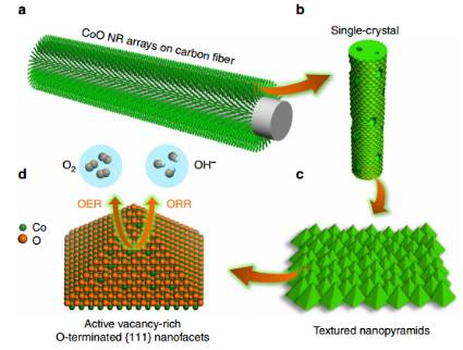 Engineering the surface structure at the atomic level can be used to precisely and effectively manipulate the reactivity and durability of catalysts. Here we report tuning of the atomic structure of one-dimensional single-crystal cobalt (II) oxide (CoO) nanorods by creating oxygen vacancies on pyramidal nanofacets. These CoO nanorods exhibit superior catalytic activity and durability towards oxygen reduction/evolution reactions. The combined experimental studies, microscopic and spectroscopic characterization, and density functional theory calculations reveal that the origins of the electrochemical activity of single-crystal CoO nanorods are in the oxygen vacancies that can be readily created on the oxygen-terminated {111} nanofacets, which favourably affect the electronic structure of CoO, assuring a rapid charge transfer and optimal adsorption energies for intermediates of oxygen reduction/evolution reactions. These results show that the surface atomic structure engineering is important for the fabrication of efficient and durable electrocatalysts.