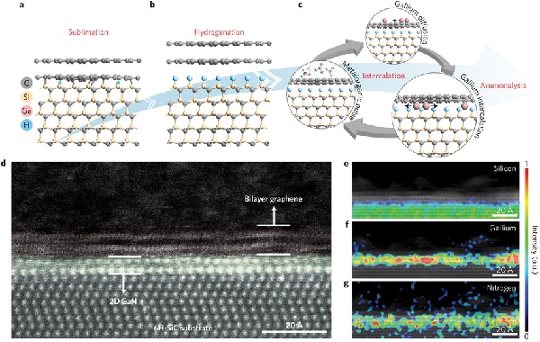 The spectrum of two-dimensional (2D) and layered materials ‘beyond graphene’ offers a remarkable platform to study new phenomena in condensed matter physics. Among these materials, layered hexagonal boron nitride (hBN), with its wide bandgap energy (~5.0–6.0 eV), has clearly established that 2D nitrides are key to advancing 2D devices. A gap, however, remains between the theoretical prediction of 2D nitrides ‘beyond hBN’ and experimental realization of such structures. Here we demonstrate the synthesis of 2D gallium nitride (GaN) via a migration-enhanced encapsulated growth (MEEG) technique utilizing epitaxial graphene. We theoretically predict and experimentally validate that the atomic structure of 2D GaN grown via MEEG is notably different from reported theory. Moreover, we establish that graphene plays a critical role in stabilizing the direct-bandgap (nearly 5.0 eV), 2D buckled structure. Our results provide a foundation for discovery and stabilization of 2D nitrides that are difficult to prepare via traditional synthesis.