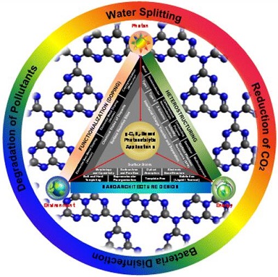 As a fascinating conjugated polymer, graphitic carbon nitride (g-C3N4) has become a new research hotspot and drawn broad interdisciplinary attention as a metal-free and visible-light-responsive photocatalyst in the arena of solar energy conversion and environmental remediation. This is due to its appealing electronic band structure, high physicochemical stability, and “earth-abundant” nature. This critical review summarizes a panorama of the latest progress related to the design and construction of pristine g-C3N4 and g-C3N4-based nanocomposites, including (1) nanoarchitecture design of bare gg-C3N4, such as hard and soft templating approaches, supramolecular preorganization assembly, exfoliation, and template-free synthesis routes, (2) functionalization of g-C3N4 at an atomic level (elemental doping) and molecular level (copolymerization), and (3) modification of g-C3N4 with well-matched energy levels of another semiconductor or a metal as a cocatalyst to form heterojunction nanostructures. The construction and characteristics of each classification of the heterojunction system will be critically reviewed, namely metal-g-C3N4, semiconductor-g-C3N4, isotype g-C3N4/g-C3N4, graphitic carbon-g-C3N4, conducting polymer-g-C3N4, sensitizer-g-C3N4, and multicomponent heterojunctions. The band structures, electronic properties, optical absorption, and interfacial charge transfer of g-C3N4-based heterostructured nanohybrids will also be theoretically discussed based on the first-principles density functional theory (DFT) calculations to provide insightful outlooks on the charge carrier dynamics. Apart from that, the advancement of the versatile photoredox applications toward artificial photosynthesis (water splitting and photofixation of CO2), environmental decontamination, and bacteria disinfection will be presented in detail. Last but not least, this comprehensive review will conclude with a summary and some invigorating perspectives on the challenges and future directions at the forefront of this research platform. It is anticipated that this review can stimulate a new research doorway to facilitate the next generation of g-C3N4-based photocatalysts with ameliorated performances by harnessing the outstanding structural, electronic, and optical properties for the development of a sustainable future without environmental detriment.