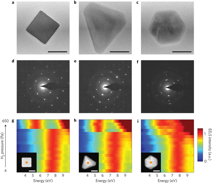 Strain and defects can significantly impact the performance of functional nanomaterials. This effect is well exemplified by energy storage systems, in which structural changes such as volume expansion and defect generation govern the phase transformations associated with charging and discharging. The rational design of next-generation storage materials therefore depends crucially on understanding the correlation between the structure of individual nanoparticles and their solute uptake and release. Here, we experimentally reconstruct the spatial distribution of hydride phases within individual palladium nanocrystals during hydrogen absorption, using a combination of electron spectroscopy, dark-field imaging, and electron diffraction in an environmental transmission electron microscope. We show that single-crystalline cubes and pyramids exhibit a uniform hydrogen distribution at equilibrium, whereas multiply twinned icosahedra exclude hydrogen from regions of high compressive strains. Our technique offers unprecedented insight into nanoscale phase transformations in reactive environments and can be extended to a variety of functional nanomaterials.