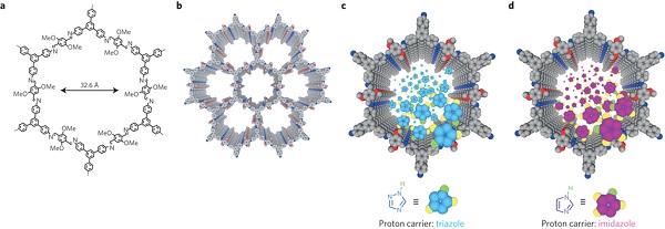 Progress over the past decades in proton-conducting materials has generated a variety of polyelectrolytes and microporous polymers. However, most studies are still based on a preconception that large pores eventually cause simply flow of proton carriers rather than efficient conduction of proton ions, which precludes the exploration of large-pore polymers for proton transport. Here, we demonstrate proton conduction across mesoporous channels in a crystalline covalent organic framework. The frameworks are designed to constitute hexagonally aligned, dense, mesoporous channels that allow for loading of N-heterocyclic proton carriers. The frameworks achieve proton conductivities that are 2–4 orders of magnitude higher than those of microporous and non-porous polymers. Temperature-dependent and isotopic experiments revealed that the proton transport in these channels is controlled by a low-energy-barrier hopping mechanism. Our results reveal a platform based on porous covalent organic frameworks for proton conduction.