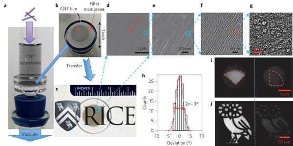 The one-dimensional character of electrons, phonons and excitons in individual single-walled carbon nanotubes leads to extremely anisotropic electronic, thermal and optical properties. However, despite significant efforts to develop ways to produce large-scale architectures of aligned nanotubes, macroscopic manifestations of such properties remain limited. Here, we show that large (>cm2) monodomain films of aligned single-walled carbon nanotubes can be prepared using slow vacuum filtration. The produced films are globally aligned within ±1.5° (a nematic order parameter of ∼1) and are highly packed, containing 1 × 106 nanotubes in a cross-sectional area of 1 μm2. The method works for nanotubes synthesized by various methods, and film thickness is controllable from a few nanometres to ∼100 nm. We use the approach to create ideal polarizers in the terahertz frequency range and, by combining the method with recently developed sorting techniques, highly aligned and chirality-enriched nanotube thin-film devices. Semiconductor-enriched devices exhibit polarized light emission and polarization-dependent photocurrent, as well as anisotropic conductivities and transistor action with high on/off ratios.