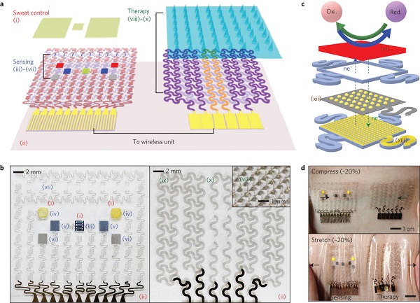 Owing to its high carrier mobility, conductivity, flexibility and optical transparency, graphene is a versatile material in micro- and macroelectronics. However, the low density of electrochemically active defects in graphene synthesized by chemical vapour deposition limits its application in biosensing. Here, we show that graphene doped with gold and combined with a gold mesh has improved electrochemical activity over bare graphene, sufficient to form a wearable patch for sweat-based diabetes monitoring and feedback therapy. The stretchable device features a serpentine bilayer of gold mesh and gold-doped graphene that forms an efficient electrochemical interface for the stable transfer of electrical signals. The patch consists of a heater, temperature, humidity, glucose and pH sensors and polymeric microneedles that can be thermally activated to deliver drugs transcutaneously. We show that the patch can be thermally actuated to deliver Metformin and reduce blood glucose levels in diabetic mice.