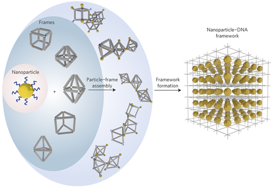 Advances in self-assembly over the past decade have demonstrated that nano- and microscale particles can be organized into a large diversity of ordered three-dimensional (3D) lattices. However, the ability to generate different desired lattice types from the same set of particles remains challenging. Here, we show that nanoparticles can be assembled into crystalline and open 3D frameworks by connecting them through designed DNA-based polyhedral frames. The geometrical shapes of the frames, combined with the DNA-assisted binding properties of their vertices, facilitate the well-defined topological connections between particles in accordance with frame geometry. With this strategy, different crystallographic lattices using the same particles can be assembled by introduction of the corresponding DNA polyhedral frames. This approach should facilitate the rational assembly of nanoscale lattices through the design of the unit cell.