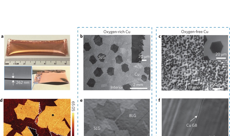 Bernal (AB)-stacked bilayer graphene (BLG) is a semiconductor whose bandgap can be tuned by a transverse electric field, making it a unique material for a number of electronic and photonic devices. A scalable approach to synthesize high-quality BLG is therefore critical, which requires minimal crystalline defects in both graphene layers and maximal area of Bernal stacking, which is necessary for bandgap tunability. Here we demonstrate that in an oxygen-activated chemical vapour deposition (CVD) process, half-millimetre size, Bernal-stacked BLG single crystals can be synthesized on Cu. Besides the traditional ‘surface-limited’ growth mechanism for SLG (1st layer), we discovered new microscopic steps governing the growth of the 2nd graphene layer below the 1st layer as the diffusion of carbon atoms through the Cu bulk after complete dehydrogenation of hydrocarbon molecules on the Cu surface, which does not occur in the absence of oxygen. Moreover, we found that the efficient diffusion of the carbon atoms present at the interface between Cu and the 1st graphene layer further facilitates growth of large domains of the 2nd layer. The CVD BLG has superior electrical quality, with a device on/off ratio greater than 104, and a tunable bandgap up to ∼100 meV at a displacement field of 0.9 V nm-1.
