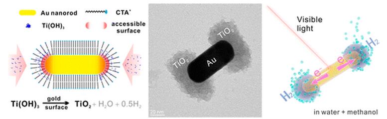 Plasmonic metal/semiconductor heterostructures show promise for visible-light-driven photocatalysis. Gold nanorods (AuNRs) semi-coated with TiO2 are expected to be ideally structured systems for hydrogen evolution. Synthesizing such structures by wet-chemistry methods, however, has proved challenging. Here we report the bottom-up synthesis of AuNR/TiO2 nanodumbbells (NDs) with spatially separated Au/TiO2 regions, whose structures are governed by the NRs’ diameter, and the higher curvature and lower density of CnTAB surfactant at the NRs’ tips than on their lateral surfaces, as well as the morphology’s dependence on concentration, and alkyl chain length of CnTAB. The NDs show plasmon-enhanced H2 evolution under visible and near-infrared light.