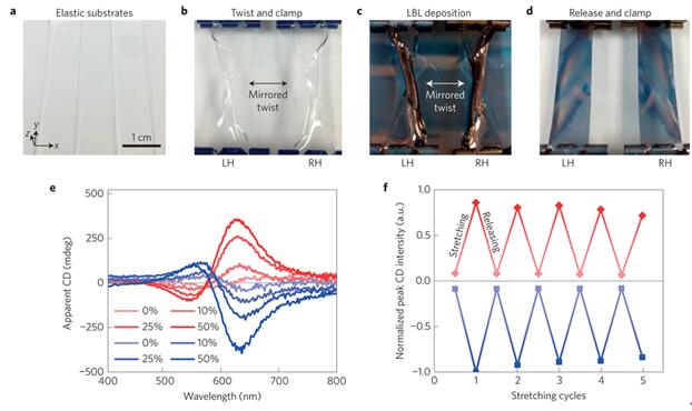 Nanostructures with chiral geometries exhibit strong polarization rotation. However, achieving reversible modulation of chirality and polarization rotation in device-friendly solid-state films is difficult for rigid materials. Here, we describe nanocomposites, made by conformally coating twisted elastic substrates with films assembled layer-by-layer from plasmonic nanocolloids, whose nanoscale geometry and rotatory optical activity can be reversibly reconfigured and cyclically modulated by macroscale stretching, with up to tenfold concomitant increases in ellipticity. We show that the chiroptical activity at 660 nm of gold nanoparticle composites is associated with circular extinction from linear effects. The polarization rotation at 550 nm originates from the chirality of nanoparticle chains with an S-like shape that exhibit a non-planar buckled geometry, with the handedness of the substrate’s macroscale twist determining the handedness of the S-like chains. Chiroptical effects at the nexus of mechanics, excitonics and plasmonics open new operational principles for optical and optoelectronic devices from nanoparticles, carbon nanotubes and other nanoscale components.
