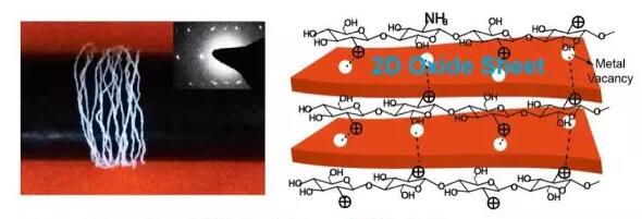 The strong interest in macroscopic graphene and/or carbon nanotube (CNT) fiber has highlighted that anisotropic nanostructured materials are ideal components for fabricating fiber assemblies. Prospectively, employing two-dimensional (2D) crystals or nanosheets of functionality-rich transition metal oxides would notably enrich the general knowledge for desirable fiber constructions and more importantly would greatly broaden the scope of functionalities. However, the fibers obtained up to now have been limited to carbon-related materials, while those made of 2D crystals of metal oxides have not been achieved, probably due to the intrinsically low mechanical stiffness of a molecular sheet of metal oxides, which is only few hundredths of that for graphene. Here, using 2D titania sheets as an illustrating example, we present the first successful fabrication of macroscopic fiber of metal oxides composed of highly aligned stacking sheets with enhanced sheet-to-sheet binding interactions. Regardless of the intrinsically weak Ti–O bond in molecular titania sheets, the optimal fiber manifested mechanical performance comparable to that documented for graphene or CNTs. This work provided important hints for devising optimized architecture in macroscopic assemblies, and the rich functionalities of titania promises fibers with limitless promise for a wealth of innovative applications.