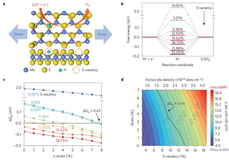 As a promising non-precious catalyst for the hydrogen evolution reaction (HER;), molybdenum disulphide (MoS2) is known to contain active edge sites and an inert basal plane. Activating the MoS2 basal plane could further enhance its HER activity but is not often a strategy for doing so. Herein, we report the first activation and optimization of the basal plane of monolayer 2H-MoS2 for HER by introducing sulphur (S) vacancies and strain. Our theoretical and experimental results show that the S-vacancies are new catalytic sites in the basal plane, where gap states around the Fermi level allow hydrogen to bind directly to exposed Mo atoms. The hydrogen adsorption free energy (ΔGH) can be further manipulated by straining the surface with S-vacancies, which fine-tunes the catalytic activity. Proper combinations of S-vacancy and strain yield the optimal ΔGH = 0 eV, which allows us to achieve the highest intrinsic HER activity among molybdenum-sulphide-based catalysts.