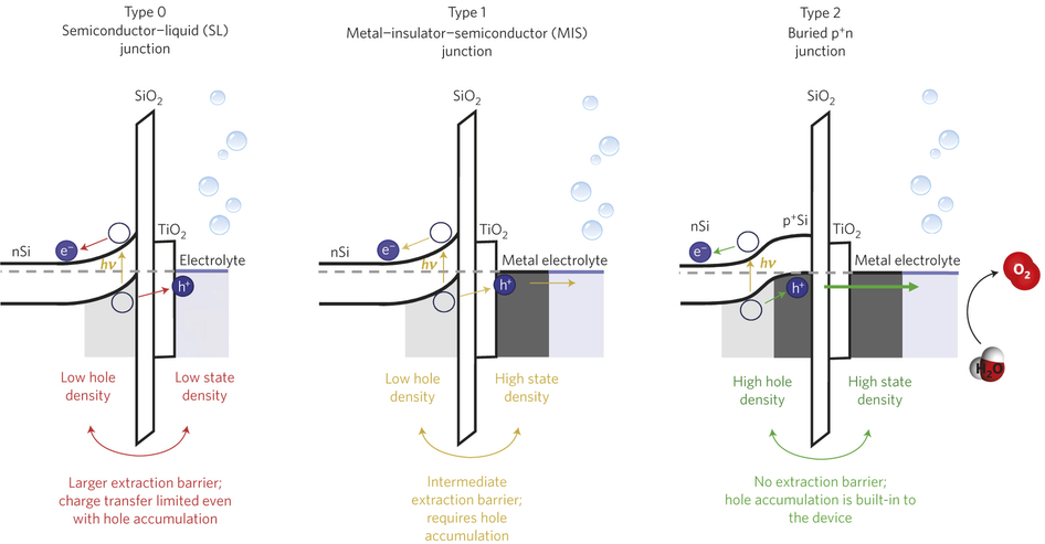 Metal oxide protection layers for photoanodes may enable the development of large-scale solar fuel and solar chemical synthesis, but the poor photovoltages often reported so far will severely limit their performance. Here we report a novel observation of photovoltage loss associated with a charge extraction barrier imposed by the protection layer, and, by eliminating it, achieve photovoltages as high as 630 mV, the maximum reported so far for water-splitting silicon photoanodes. The loss mechanism is systematically probed in metal–insulator–semiconductor Schottky junction cells compared to buried junction p+n cells, revealing the need to maintain a characteristic hole density at the semiconductor/insulator interface. A leaky-capacitor model related to the dielectric properties of the protective oxide explains this loss, achieving excellent agreement with the data. From these findings, we formulate design principles for simultaneous optimization of built-in field, interface quality, and hole extraction to maximize the photovoltage of oxide-protected water-splitting anodes.