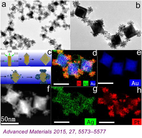 Trimetallic Au/Ag/Pt hetero-nanostructures (AAPHNs) with distinctive, designed morphology are synthesized by galvanic replacement reaction and a site-selective strategy. The three metals present on the surface are shown to act synergistically to enhance the electro-catalytic performance and durability for methanol oxidation. The described structural modification of the nanocomposites increases the range of potential applications to include both the oxygen reduction reaction in fuel cells and photocatalysis of the hydrogen evolution reaction.
