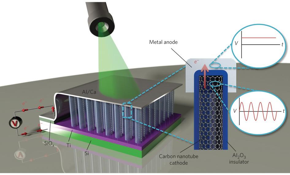 An optical rectenna—a device that directly converts free-propagating electromagnetic waves at optical frequencies to direct current—was first proposed over 40 years ago, yet this concept has not been demonstrated experimentally due to fabrication challenges at the nanoscale. Realizing an optical rectenna requires that an antenna be coupled to a diode that operates on the order of 1 pHz (switching speed on the order of 1 fs). Diodes operating at these frequencies are feasible if their capacitance is on the order of a few attofarads, but they remain extremely difficult to fabricate and to reliably couple to a nanoscale antenna. Here we demonstrate an optical rectenna by engineering metal–insulator–metal tunnel diodes, with a junction capacitance of ∼2 aF, at the tip of vertically aligned multiwalled carbon nanotubes (∼10 nm in diameter), which act as the antenna. Upon irradiation with visible and infrared light, we measure a d.c. open-circuit voltage and a short-circuit current that appear to be due to a rectification process (we account for a very small but quantifiable contribution from thermal effects). In contrast to recent reports of photodetection based on hot electron decay in a plasmonic nanoscale antenna, a coherent optical antenna field appears to be rectified directly in our devices, consistent with rectenna theory. Finally, power rectification is observed under simulated solar illumination, and there is no detectable change in diode performance after numerous current–voltage scans between 5 and 77 °C, indicating a potential for robust operation.