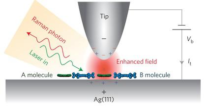 Unambiguous chemical identification of individual molecules closely packed on a surface can offer the possibility to address single chemical species and monitor their behaviour at the individual level. Such a degree of spatial resolution can in principle be achieved by detecting their vibrational fingerprints using tip-enhanced Raman scattering (TERS). The chemical specificity of TERS can be combined with the high spatial resolution of scanning probe microscopy techniques, an approach that has stimulated extensive research in the field. Recently, the development of nonlinear TERS in a scanning tunnelling microscope has pushed the spatial resolution down to …0.5 nm, allowing the identification of the vibrational fingerprints of isolated molecules on Raman-silent metal surfaces. Although the nonlinear TERS component is likely to help sharpen the optical contrast of the acquired image, the TERS signal still contains a considerable contribution from the linear term, which is spatially less confined. Therefore, in the presence of different adjacent molecules, a mixing of Raman signals may result. Here, we show that using a nonlinear scanning tunnelling microscope-controlled TERS set-up, two different adjacent molecules that are within van der Waals contact and of very similar chemical structure (a metal-centred porphyrin and a free-base porphyrin) on a silver surface can be distinguished in real space. In addition, with the help of density functional theory simulations, we are also able to determine their adsorption configurations and orientations on step edges and terraces.