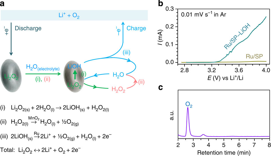 Lithium-oxygen cells have attracted extensive interests due to their high theoretical energy densities. The main challenges are the low round-trip efficiency and cycling instability over long time. However, even in the state-of-the-art lithium-oxygen cells the charge potentials are as high as 3.5 V that are higher by 0.70 V than the discharge potentials. Here we report a reaction mechanism at an oxygen cathode, ruthenium and manganese dioxide nanoparticles supported on carbon black Super P by applying a trace amount of water in electrolytes to catalyse the cathode reactions of lithium-oxygen cells during discharge and charge. This can significantly reduce the charge overpotential to 0.21 V, and results in a small discharge/charge potential gap of 0.32 V and superior cycling stability of 200 cycles. The overall reaction scheme will alleviate side reactions involving carbon and electrolytes, and shed light on the construction of practical, rechargeable lithium-oxygen cells.