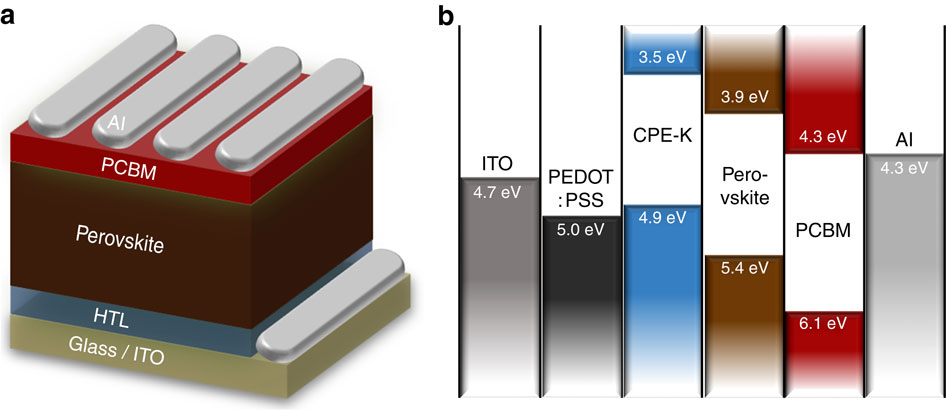 Organic-inorganic hybrid perovskite materials offer the potential for realization of low-cost and flexible next-generation solar cells fabricated by low-temperature solution processing. Although efficiencies of perovskite solar cells have dramatically improved up to 19% within the past 5 years, there is still considerable room for further improvement in device efficiency and stability through development of novel materials and device architectures. Here we demonstrate that inverted-type perovskite solar cells with pH-neutral and low-temperature solution-processable conjugated polyelectrolyte as the hole transport layer (instead of acidic PEDOT:PSS) exhibit a device efficiency of over 12% and improved device stability in air. As an alternative to PEDOT:PSS, this work is the first report on the use of an organic hole transport material that enables the formation of uniform perovskite films with complete surface coverage and the demonstration of efficient, stable perovskite/fullerene planar heterojunction solar cells.