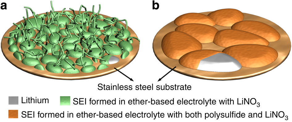 Lithium metal has shown great promise as an anode material for high-energy storage systems, owing to its high theoretical specific capacity and low negative electrochemical potential. Unfortunately, uncontrolled dendritic and mossy lithium growth, as well as electrolyte decomposition inherent in lithium metal-based batteries, cause safety issues and low Coulombic efficiency. Here we demonstrate that the growth of lithium dendrites can be suppressed by exploiting the reaction between lithium and lithium polysulfide, which has long been considered as a critical flaw in lithium–sulfur batteries. We show that a stable and uniform solid electrolyte interphase layer is formed due to a synergetic effect of both lithium polysulfide and lithium nitrate as additives in ether-based electrolyte, preventing dendrite growth and minimizing electrolyte decomposition. Our findings allow for re-evaluation of the reactions regarding lithium polysulfide, lithium nitrate and lithium metal, and provide insights into solving the problems associated with lithium metal anodes.
