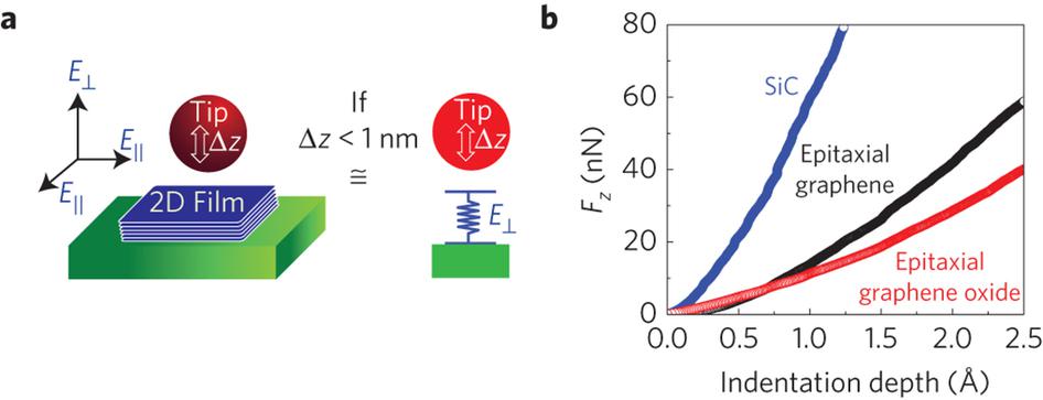 Two-dimensional materials, such as graphene and MoS2, are films of a few atomic layers in thickness with strong in-plane bonds and weak interactions between the layers. The in-plane elasticity has been widely studied in bending experiments where a suspended film is deformed substantially; however, little is known about the films?nbsp;elastic modulus perpendicular to the planes, as the measurement of the out-of-plane elasticity of supported 2D films requires indentation depths smaller than the films' interlayer distance. Here, we report on sub-angstrom-resolution indentation measurements of the perpendicular-to-the-plane elasticity of 2D materials. Our indentation data, combined with semi-analytical models and density functional theory, are then used to study the perpendicular elasticity of few-layer-thick graphene and graphene oxide films. We find that the perpendicular Young's modulus of graphene oxide films reaches a maximum when one complete water layer is intercalated between the graphitic planes. This non-destructive methodology can map interlayer coupling and intercalation in 2D films.