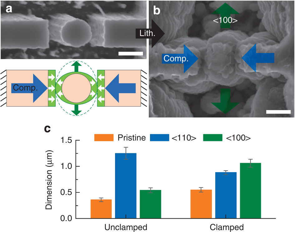 Following an explosion of studies of silicon as a negative electrode for Li-ion batteries, the anomalous volumetric changes and fracture of lithiated single Si particles have attracted significant attention in various fields, including mechanics. However, in real batteries, lithiation occurs simultaneously in clusters of Si in a confined medium. Hence, understanding how the individual Si structures interact during lithiation in a closed space is necessary. Here, we demonstrate physical and mechanical interactions of swelling Si structures during lithiation using well-defined Si nanopillar pairs. Ex situ SEM and in situ TEM studies reveal that compressive stresses change the reaction kinetics so that preferential lithiation occurs at free surfaces when the pillars are mechanically clamped. Such mechanical interactions enhance the fracture resistance of lithiated Si by lessening the tensile stress concentrations in Si structures. This study will contribute to improved design of Si structures at the electrode level for high-performance Li-ion batteries.