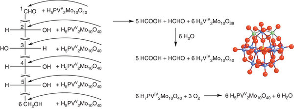 Terrestrial plants contain ~70% hemicellulose and cellulose that are a significant renewable bioresource with potential as an alternative to petroleum feedstock for carbon-based fuels. The efficient and selective deconstruction of carbohydrates to their basic components, carbon monoxideand hydrogen, so called synthesis gas, is an important key step towards the realization of this potential, because the formation of liquid hydrocarbon fuels from synthesis gas are known technologies. Here we show that by using a polyoxometalate as an electron transfer–oxygen transfer catalyst, carbon monoxide is formed by cleavage of all the carbon–carbon bonds through dehydration of initially formed formic acid. In this oxidation–reduction reaction, the hydrogen atoms are stored on the polyoxometalate as protons and electrons, and can be electrochemically released from the polyoxometalate as hydrogen. Together, synthesis gas is formed. In a hydrogen economy scenario, this method can also be used to convert carbon monoxide to hydrogen.
