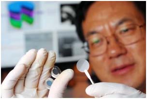 Georgia Tech researcher Zhong Lin Wang holds the components of a new self-charging power cell that uses piezoelectric materials to directly convert mechanical energy to chemical energy. The chemical energy can be released as electricity.