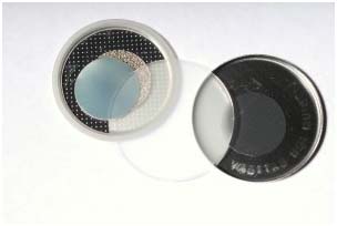 Components of a new self-charging piezoelectric power cell are shown in this photo. The clear disc in the center is the piezoelectric film that serves as a charge pump for lithium ions.