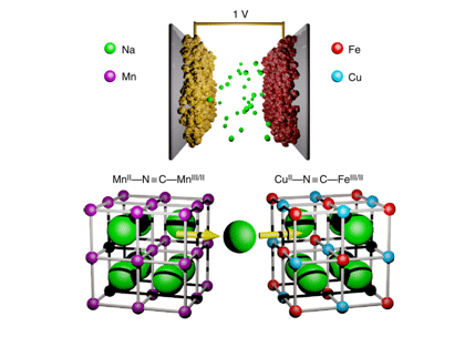 This new type of safe, fast, inexpensive, long-cycle life aqueous electrolyte battery relies on the insertion of sodium ions into the copper hexacyanoferrate (CuII—N≡C—FeIII/II) cathode and a newly developed manganese hexacyanomanganate (MnII—N≡C—MnIII/II) anode, each of which have the same open framework crystal structure.