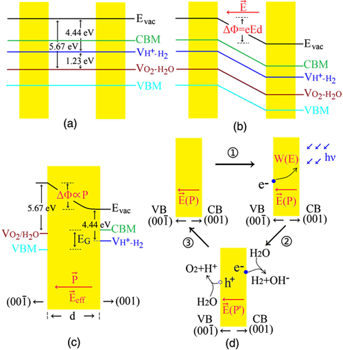 As an ultimate solution for today’s more and more serious energy and environmental problems, solar energy is abundant and clean, and it can be converted into chemical fuel, biomass, or electricity, or directly stored as thermal energy. An important branch of solar-to-chemical energy conversion, hydrogen production from photocatalytic water splitting, viewed as an artificial photosynthesis, has been eagerly pursued since its first proposal in 1972. The key issue in photocatalytic water splitting is to develop photocatalysts with high solar energy conversion efficiency. However, until now, the infrared part of the solar spectrum, which constitutes almost half of the solar energy, has not been used, resulting in significant loss in the efficiency of solar energy utilization. Here, they propose a new mechanism for water splitting in which near-infrared light can be used to produce hydrogen. This ability is a result of the unique electronic structure of the photocatalyst, in which the valence band and conduction band are distributed on two opposite surfaces with a large electrostatic potential difference produced by the intrinsic dipole of the photocatalyst. This surface potential difference, acting as an auxiliary booster for photoexcited electrons, can effectively reduce the photocatalyst’s band gap required for water splitting in the infrared region. The new model is then verified in surface-functionalized hexagonal boron-nitride bilayers by first-principles electronic and optical calculations. Application of the new model to other photocatalytic processes is possible, presenting a promising future for near-infrared-light-driven photocatalysis. (Phys. Rev. Lett., 2014, 112, 018301)