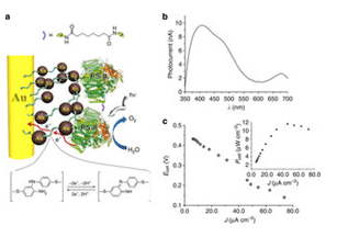The way in which a photosynthetic protein can be used in an integrated photobiofuel cell is reported in a study published in Nature Communications. The work illustrates how illumination of the cell results in the formation of electricity, without the need of sacrificial reagents. Itamar Willner and co-workers attached the photosynthetic protein photosystem II to the surface of an electrode and used this photoanode to assemble a photobiofuel cell. They report that illumination of the photoanode results in the oxidation of water to O2 and the transfer of electrons through the external circuit to the cathode, where O2 is re-reduced to water. This direct coupling of cathode and anode reactions without the need for a sacrificial reagent reduces waste, and further work could lead to the development of useful electrochemical devices.