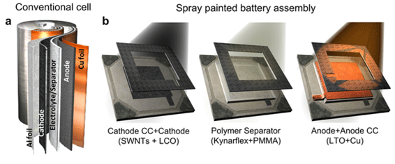 Lithium-ion (Li-ion) batteries power most of our portable electronics, due to their high energy and power density. Li-ion battery packs are compact but their ‘jellyroll’ design limits the batteries to rectangular or cylindrical shapes. Pulickel Ajayan and colleagues use a spray painting technique to fabricate batteries onto various surfaces, including diverse materials, such as glass, stainless steel and ceramic tiles, and diverse shapes, such as the curved surface of a ceramic mug. The substrate types were shown to have no effect on the performance of the batteries, suggesting that the technology could be integrated into a wide range of standard construction materials, and household objects.
