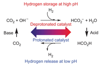 A catalyst that can reversibly use carbon dioxide and hydrogen to store energy is reported online in Nature Chemistry. The catalyst converts these simple compounds into formic acid, a promising hydrogen-storage medium, and also catalyses the reaction to re-release the hydrogen. Although using hydrogen as a fuel is highly desirable because of its clean nature, it suffers from many drawbacks such as safety risks and transport problems. Storing it as a gas or in solid materials does not fully alleviate the transport concerns, but the current fuel infrastructure - tankers, pipelines, gas pumps - is well suited to a liquid solution. Jonathan Hull, Yuichiro Himeda, Etsuko Fujita and colleagues’ catalyst is energy efficient and green, working under mild conditions and using just water as the solvent. The parts of the catalyst that surround the central iridium metal atom are able to control whether it produces or consumes hydrogen, because they are sensitive to the pH of the solution.