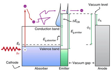 Hot carrier harvesting is an approach for overcoming limits to solar energy efficiency that captures electrons that have been heated up by light before they lose their energy to the surrounding material. In photon-enhanced thermionic emission - a recent method for hot carrier harvesting - the electrons and the underlying crystal lattice are heated to the same temperature, so it is no longer necessary to capture the electrons before they lose their energy. This means there is more time to convert the electrons into useful energy. However, the efficiency for this process is currently too low to be practical. Nick Melosh and colleagues address this problem by building a structure from two semiconductors and showing that the resulting interface dramatically enhances the efficiency. They show that further improvements are possible by using different coatings on the surface of the device.