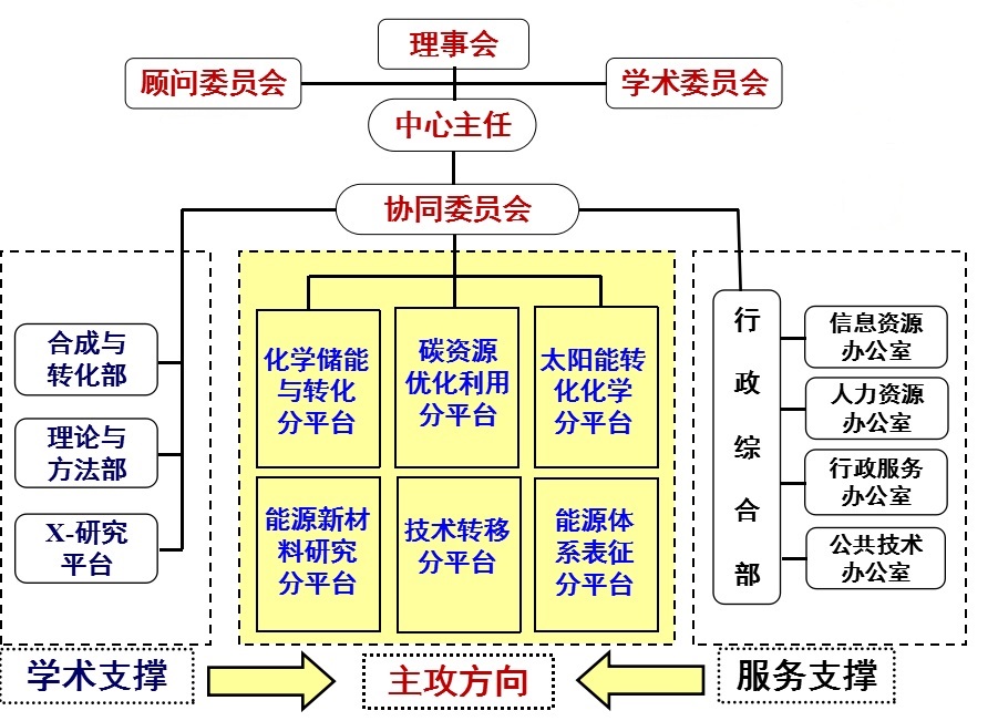 协同中心设理事会、学术委员会、若干研究部(每个研究部下设若干个研究团队)和行政综合部。目前,协同中心设碳资源优化利用、化学储能与转化、太阳能转化化学三个主攻方向研究部,和开展前瞻性、非共识性探索和跨学科交叉研究的X-研究部,以及合成制备、理论模拟和仪器方法三个学术支撑研究部。行政综合部下设信息资源、人力资源、行政服务、公共技术和技术转移五个办公室。