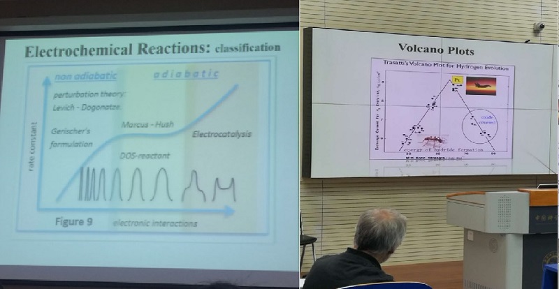 图3 左图引起了广泛的讨论与问答,右图Santos博士正在讲授火山型曲线以及其在电催化中的应用。图中人物为Schmickler教授。