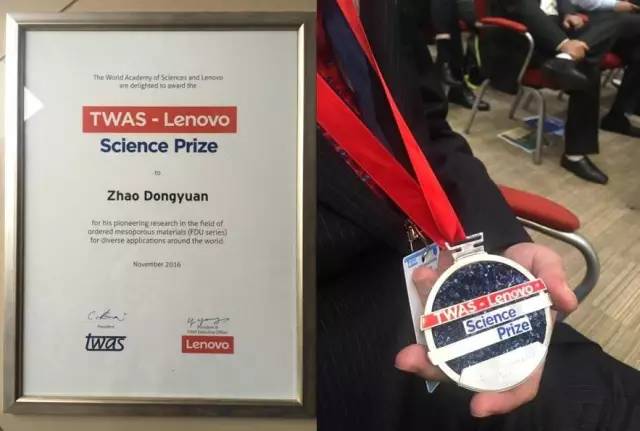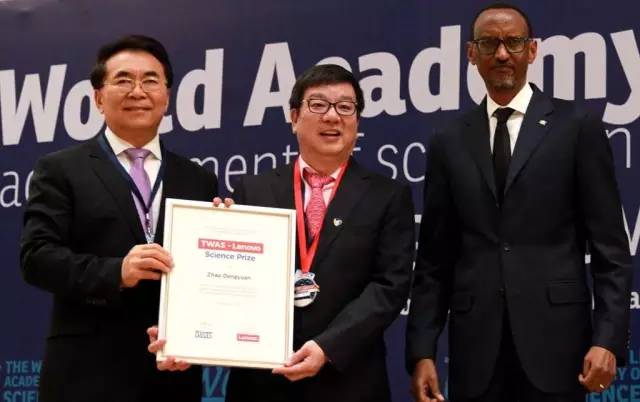 会上,白春礼与卢旺达总统保罗卡加梅共同为2016年TWAS联想科学奖获得者、复旦大学教授、中国科学家赵东元院士颁发证书和奖章。表彰赵东元院士在有序介孔分子筛(FDU系列)合成、应用中做出的杰出、开创性的贡献(Forhis pioneering and outstanding research in the field of ordered mesoporousinorganic molecular sieves (FDU series) for diverse applications around theworld)。近年来,赵东元教授团队开创了多种介孔材料合成新路线,合成了18种以复旦大学命名的FDU介孔分子筛新结构,制备了一系列热稳定的、大孔径的有序介孔氧化物材料、介孔高分子和碳材料,在介孔分子筛结构、外貌控制及多相组装机理等方面形成独特见解,为介孔材料的发展和应用做出了杰出的贡献。现任美国化学会ACSCentral Science高级编辑,Journalof the American Chemical Society等期刊编委。赵东元院士被汤森路透社列为全球化学、材料两个领域高被引科学家,也被列为最具国际影响力的中国科学家。同时赵东元院士作为国际介观材料协会(IMMS)主席,以实现可持续发展为目标,不断推动介孔材料领域的国际合作和可持续发展,极大地促进了介孔材料的发展与应用。