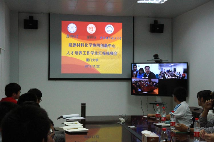 2012年11月22日下午,协同中心拔尖学生首次视频交流会如期举行,主会场设在中国科学技术大学,分别由中国科学技术大学汪志勇教授、复旦大学高翔教授和厦门大学朱亚先教授担任现场主持人。三校各推荐一名学生,以能源材料化学紧密相关的主题做汇报,每人汇报10-15分钟,提问5分钟,然后由导师、两位以上相关专业的老师组成的专家组给予点评和指导。