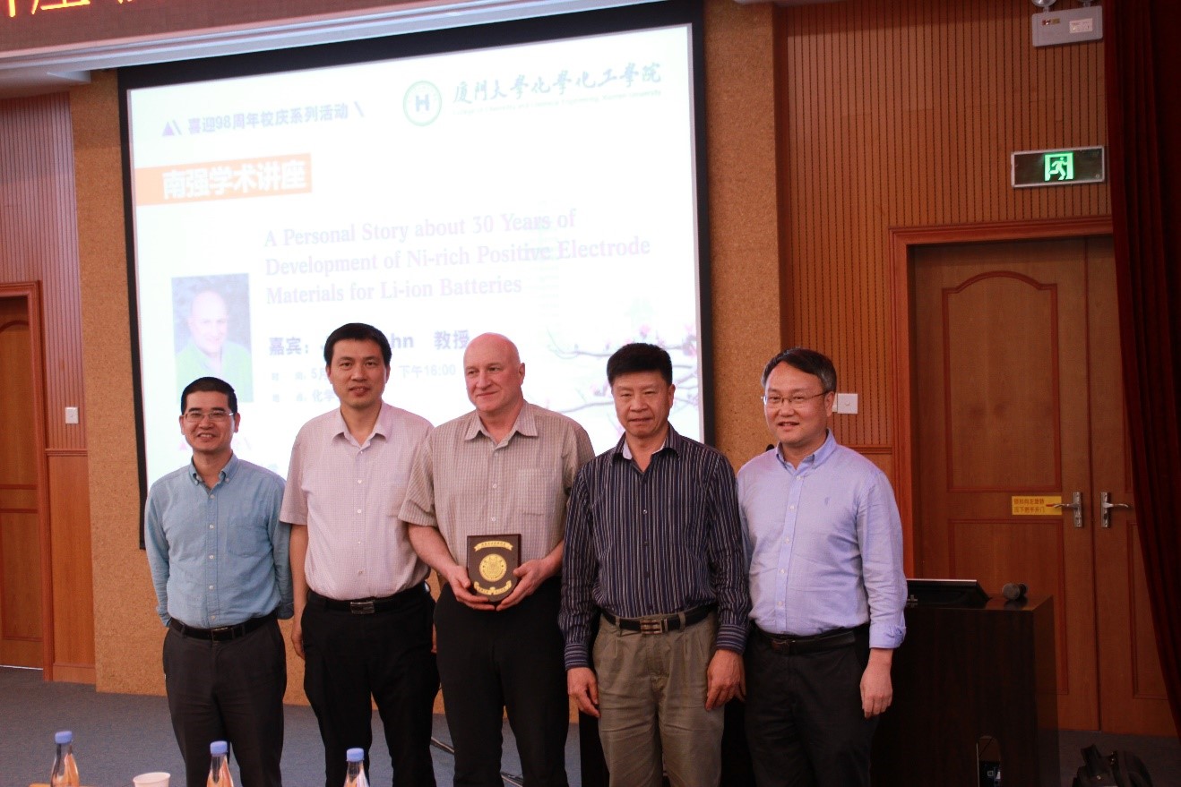 2019年5月4日,应中心研究人员邀请,国际著名锂电池专家、国际著名电动汽车公司Tesla首席科学家、加拿大皇家科学院院士Jeff Dahn教授做客厦门大学化学化工学院,并为全体师生做厦门大学最高层次“南强学术讲座”,报告题目为“A Personal Story about 30 Years of Development of Ni-rich Positive Electrode Materials for Li-ion Batteries”。讲座由中心研究人员杨勇教授主持,孙世刚院士为Dahn院士授予“南强学术讲座”荣誉铭牌。